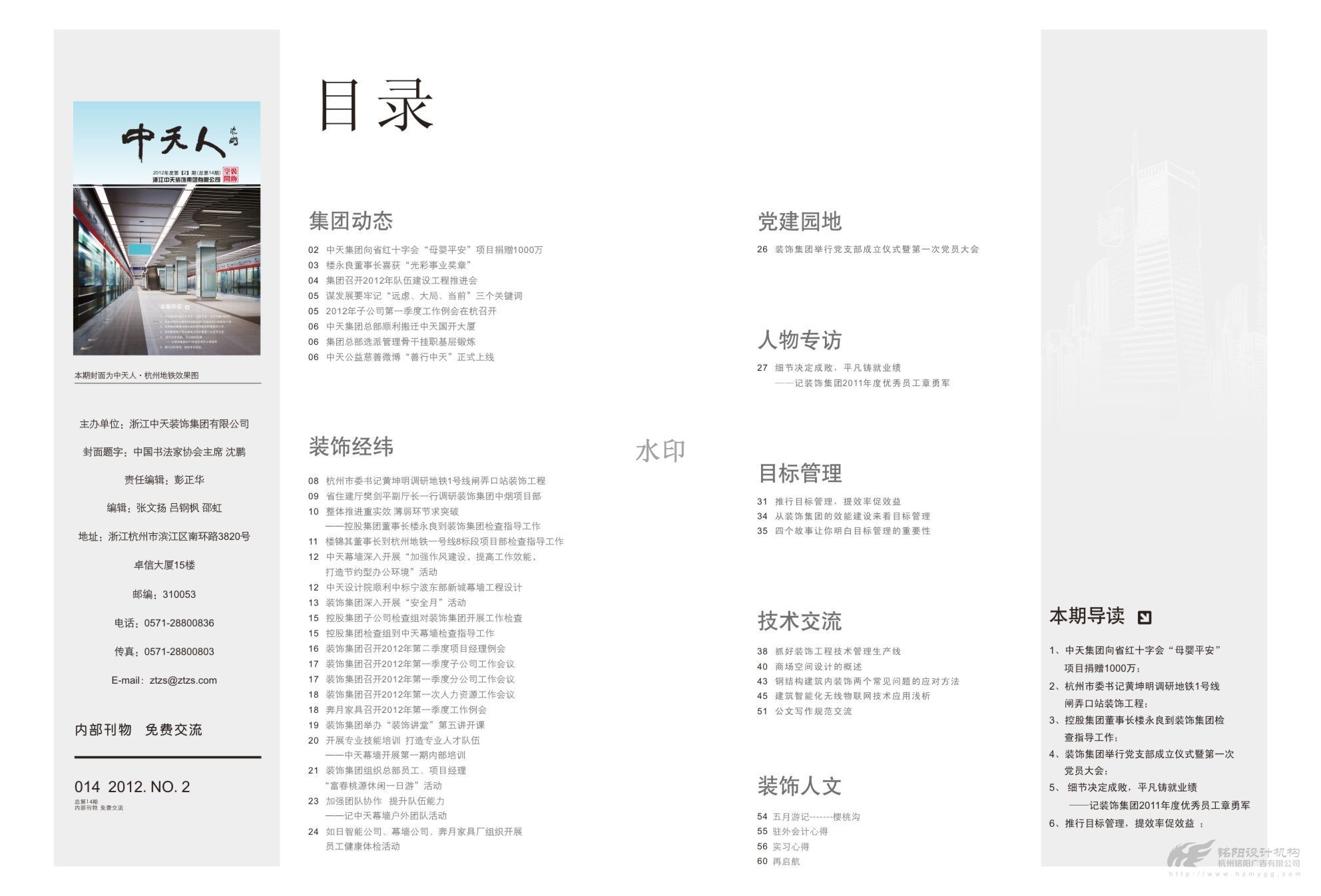 中國(guó)企業(yè)500強(qiáng)企業(yè),中國(guó)民營(yíng)企業(yè)50強(qiáng)企業(yè),中天發(fā)展控股集團(tuán)有限公司(簡(jiǎn)稱“中天集團(tuán)”)是一家以土木建筑、地產(chǎn)置業(yè)、電子??化工、投資為主要經(jīng)營(yíng)業(yè)務(wù)的全國(guó)大型企業(yè)集團(tuán)。2013年總產(chǎn)值及銷售額超600億元。下轄中天建設(shè)集團(tuán)有限公司,浙江中天房產(chǎn)集團(tuán)有限公司,中天西北建設(shè)投資集團(tuán)有限公司,浙江中天裝飾集團(tuán)有限公司,浙江新嘉聯(lián)電子股份有限公司,浙江中天氟硅材料有限公司等10多家成員企業(yè)。 銘陽(yáng)與中天集團(tuán)建立多年伙伴關(guān)系,為中天裝飾,中天建設(shè)等提供多次平面設(shè)計(jì)服務(wù),包括月刊、畫冊(cè)、說(shuō)明書、文化形象等。